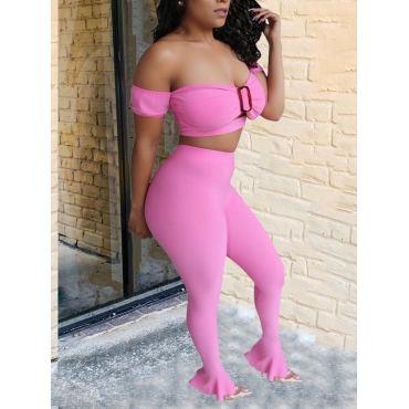 Lovely Sexy Off The Shoulder Flounce Design Pink Two Piece Pants Set
