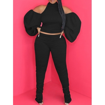 Lovely Sweet Off The Shoulder Ruched Ruffle Design Black Plus Size Two-piece Pants Set