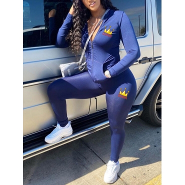 Lovely Casual Crown Print Pocket Design Dark Blue Two Piece Pants Set