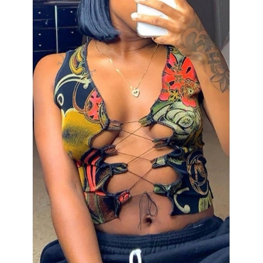 Lovely Vintage Bandage Hollow-out Design Print Brown Camisole