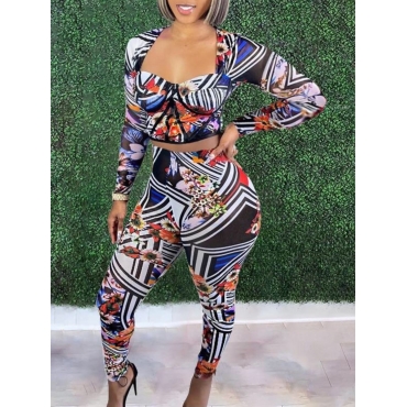 Lovely Casual Square Neck Floral Print Multicolor Two Piece Pants Set