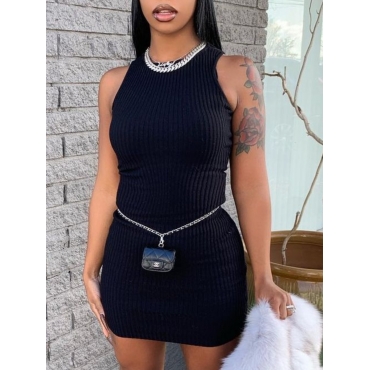 Lovely Casual O Neck Rib-Knit Black Mini Dress(Without Waist Bag)