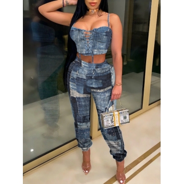 Lovely Casual Bandage Hollow-out Design Patchwork Blue Two Piece Pants Set