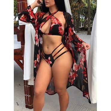 Lovely Sexy Floral Print Hollow-out Black Three-piece Swimsuit