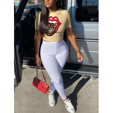 Lovely Casual O Neck Lip Print Apricot Two Piece Pants Set