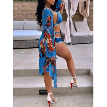 Lovely Sexy Floral Print Hollow-out Blue Three-piece Swimsuit