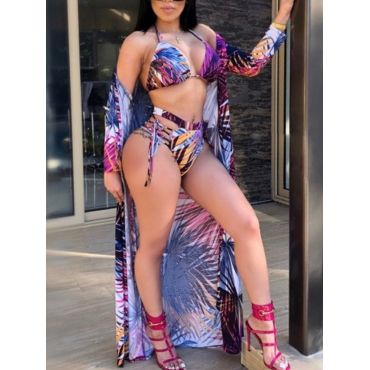 Lovely Sexy Floral Print Hollow-out Purple Three-piece Swimsuit