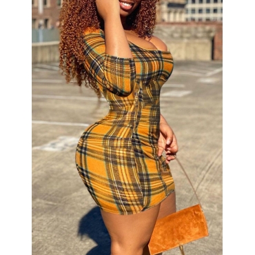 Lovely Street U Neck Plaid Print Yellow Mini Dress
