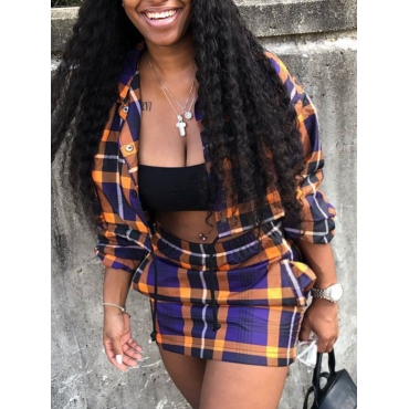 Lovely Casual Turndown Collar Plaid Print Blue Two Piece Skirt Set