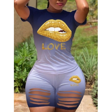 Lovely Street Gradient Lip Print Ripped Blue Two Piece Shorts Set