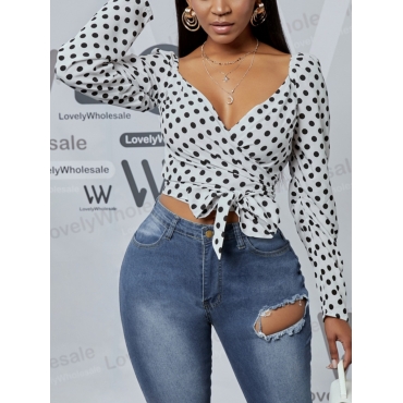 Lovely Sweet Cross-over Bandage Design Dot Print Black Blouse