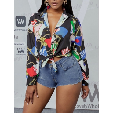 Lovely Casual Turndown Collar Print Patchwork Black Blouse