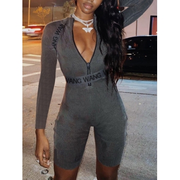Lovely Sportswear Rib-Knit Letter Print Grey One-piece Romper