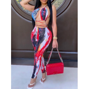 Lovely Sexy Backless Tie-dye Criss Cross Red One-piece Jumpsuit