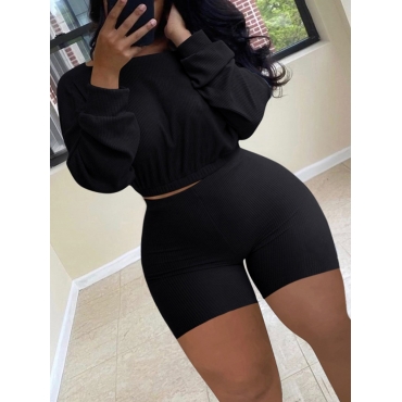 Lovely Casual O Neck Dropped Shoulder Black Plus Size Two-piece Shorts Set