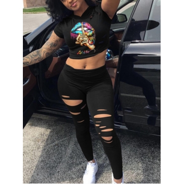 Lovely Casual Hooded Collar Print Broken Holes Black Two Piece Pants Set