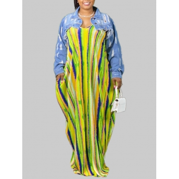 Lovely Casual Striped Patchwork Green Floor Length Plus Size Dress