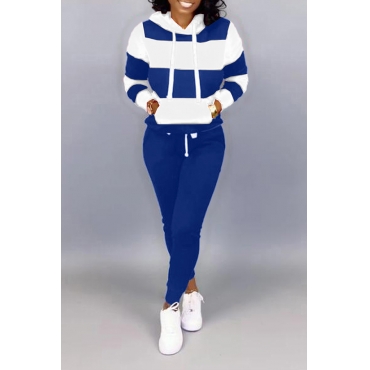 Lovely Casual Hooded Collar Patchwork Blue Two Piece Pants Set