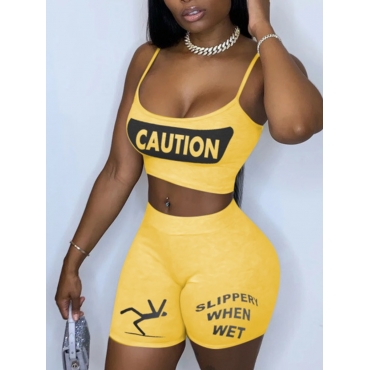 Lovely Sportswear Spaghetti Strap Letter Print Yellow Two Piece Shorts Set