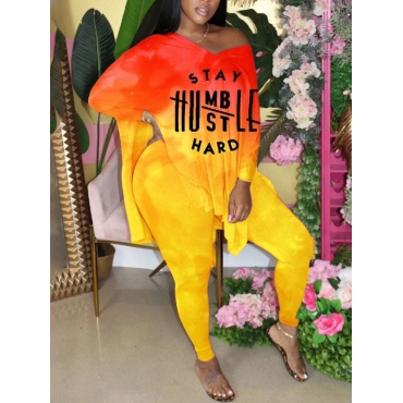 Lovely Casual V Neck Letter Print Yellow Plus Size Two-piece Pants Set