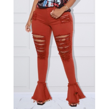 Lovely Casual Mid Waist Broken Holes Flared Red Plus Size Jeans