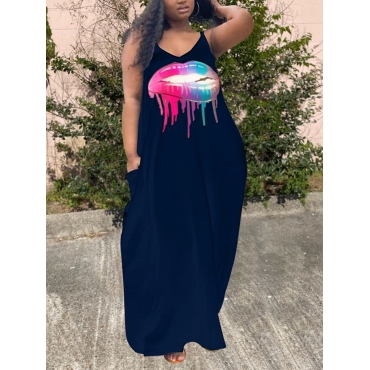 Lovely Trendy U Neck Lip Print Deep Blue Floor Length A Line Plus Size Dress