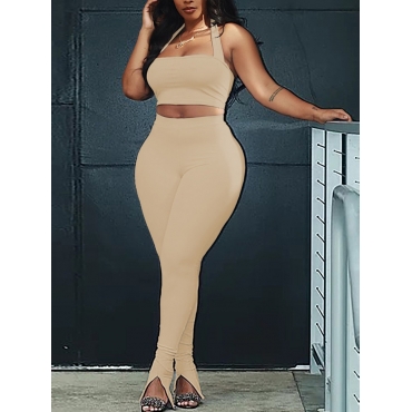 Lovely Casual Spaghetti Strap Split Khaki Plus Size Two-piece Pants Set