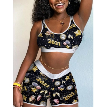 Lovely Chic Letter Star Print Patchwork Black Sleepwear