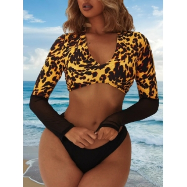 Lovely Casual V Neck Leopard Print Yellow Tankini