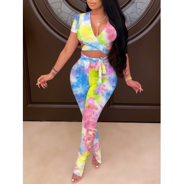 Lovely Casual Tie Dye Bandage Hollow-out Design Multicolor Two Piece Pants Set(No-positioning Printing)