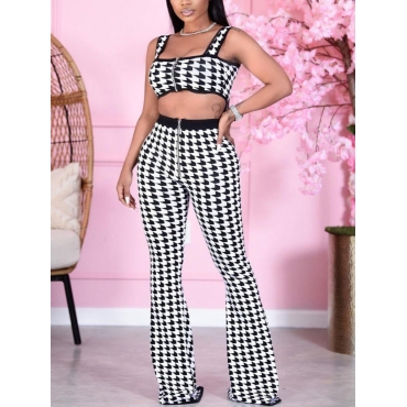 Lovely Casual Square Collar Flared Plaid Print White Two Piece Pants Set(No-positioning Printing)