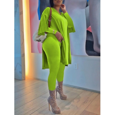 Lovely Casual O Neck Side Split Green Two Piece Pants Set