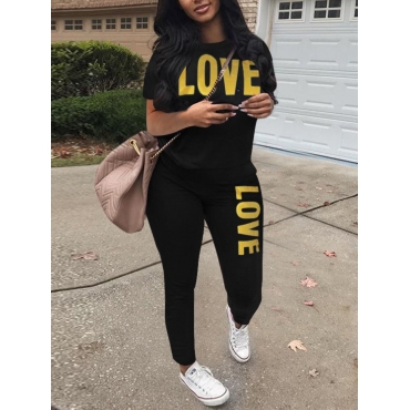 Lovely Trendy Letter Print Patchwork Black Two Piece Pants Set