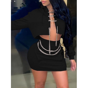 Lovely Sexy Hooded Collar Chain Decoration Black Two Piece Skirt Set