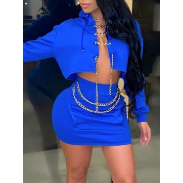 Lovely Sexy Hooded Collar Chain Decoration Blue Two Piece Skirt Set