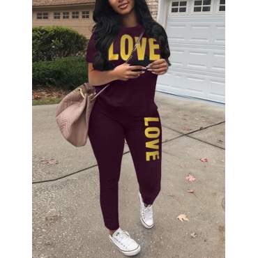 Lovely Casual O Neck Letter Print Purple Two Piece Pants Set