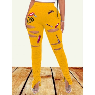 Lovely Casual High-waisted Print Broken Holes Yellow Pants