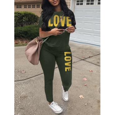 Lovely Casual O Neck Letter Print Green Two Piece Pants Set