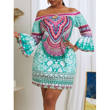 Lovely Ethnic Dew Shoulder Print Green Mini Dress