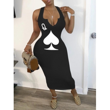 Lovely Sexy Print Black Mid Calf Dress