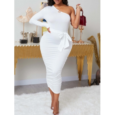 Lovely Casual One Shoulder Lace-up White Mid Calf Dress