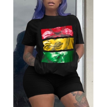 Lovely Leisure O Neck Print Black Plus Size Two-piece Shorts Set