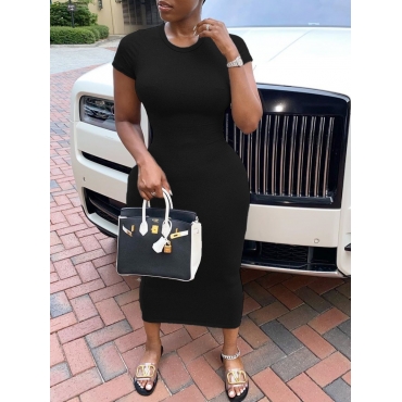 Lovely Casual O Neck Skinny Black Mid Calf Dress