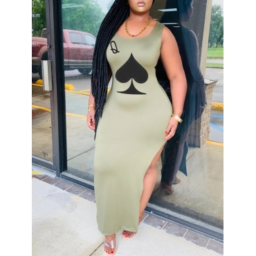 Lovely Casual U Neck Print Side High Slit Army Green Ankle Length Dress
