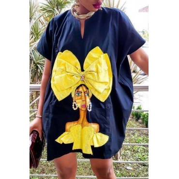 Lovely Casual Print Loose Black Mini Dress