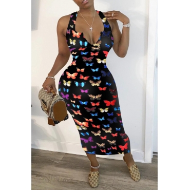 Lovely Trendy Butterfly Print Black Mid Calf Dress