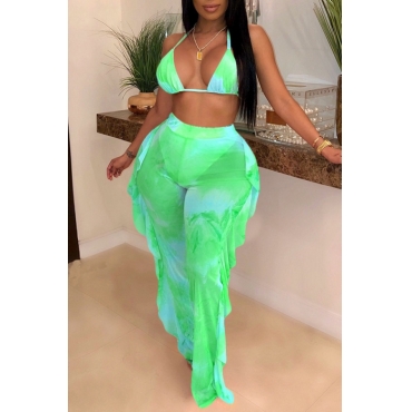 Lovely Print Ruffle Design Green Two Piece Swimsuit