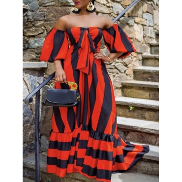 Lovely Bohemian Dew Shoulder Striped Red Maxi Dress