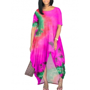 Lovely Casual O Neck Tie-dye Rose Red Maxi Dress