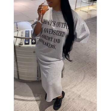 Lovely Casual O Neck Letter Print Grey Ankle Length Dress